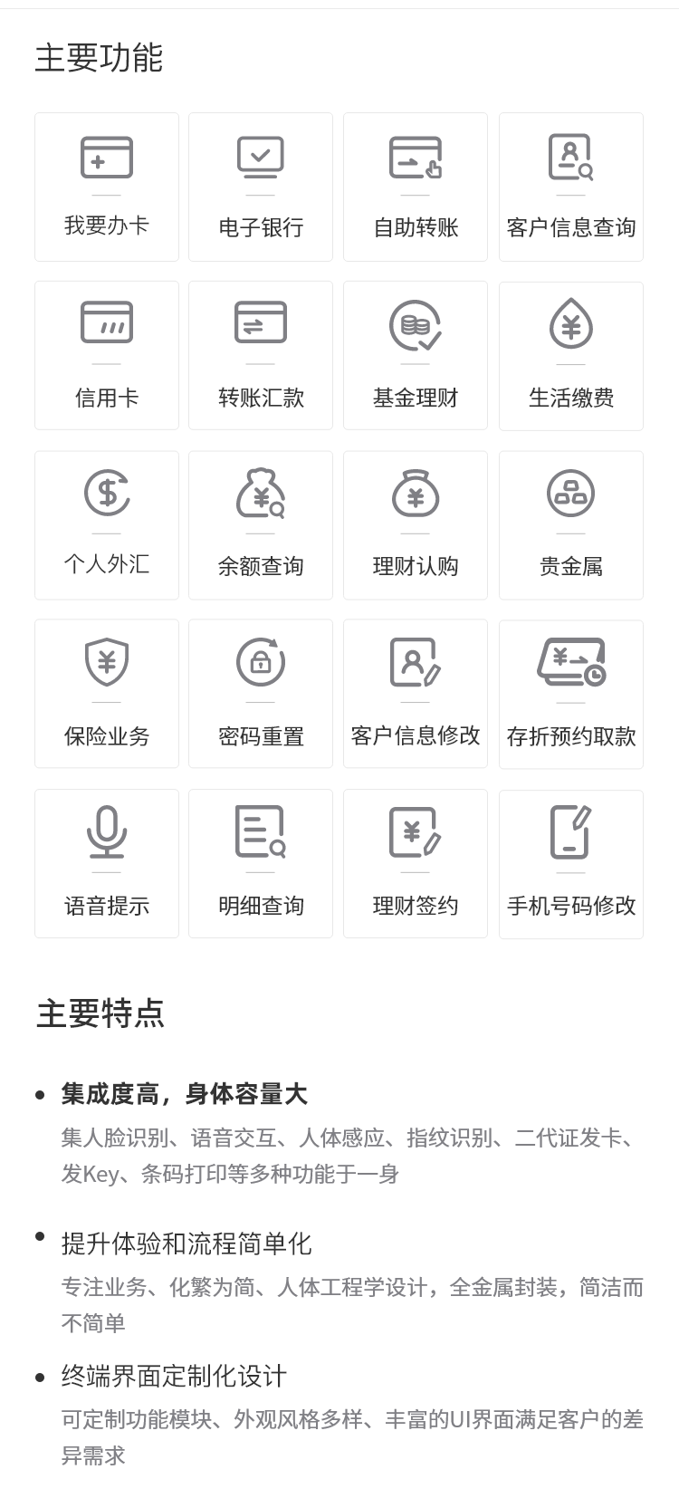 金融智能柜臺ZT2910-A03系列,19寸彩屏,極簡湊型設計,凸顯鈑金設備特有的商務感和價值感。整體外觀端莊大氣,色彩元素點綴,剛中帶柔,前開門式維護設計,集穩重與快捷于一身。可定制化功能模塊、外觀風格多樣、豐富的UI界面滿足客戶的差異化需求。